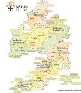 Die Karte ist urheberrechtlich geschützt, inklusive einzelner Kartenausschnitte sowie Logo und Schriftzug. Kopien auch von einzelnen Teilen in jedweder Kartenform dürfen nur nach schriftlicher Genehmigung durch das Bistum Fulda erstellt werden. Die unberechtigte Verwendung ist strafbar und kann zu Schadensersatzforderungen durch das Bistum Fulda führen. Das Bistum Fulda räumt den Pfarrgemeinden der Diözese und den kirchlichen Einrichtungen ein eingeschränktes und nicht ausschließliches Nutzungsrecht ein, das allerdings nicht auf andere Personen weiter übertragbar ist. Das Nutzungsrecht beschränkt sich auf den Ausdruck und Aushang der Karte den Räumen der Pfarrgemeinde sowie auf die Verwendung im Pfarrbrief.
